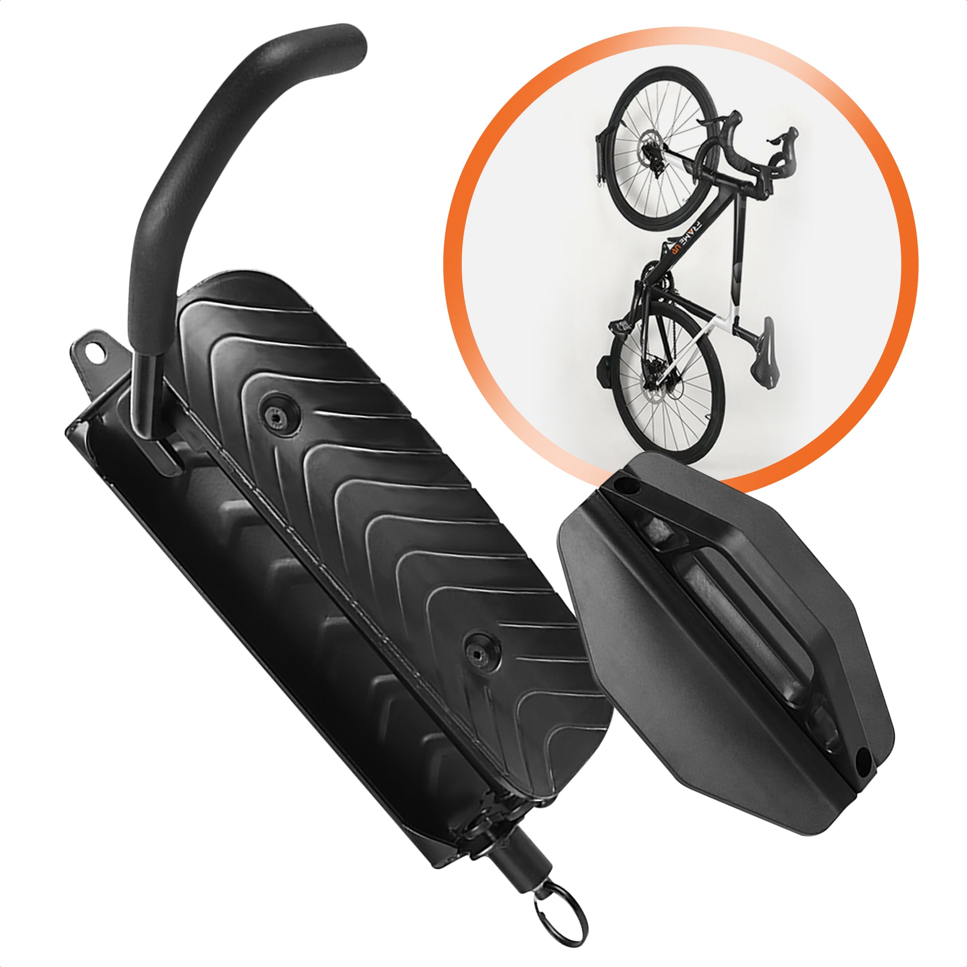 Hang je fietsen veilig en strak tegen de muur met deze stevige muurbeugels (draagkracht: 30 kg). Dankzij de 150° draaifunctie bespaar je maximaal ruimte in je garage, schuur of hal. De haak is geschikt voor racefietsen, mountainbikes en e-bikes. Inclusief slimme bandenstop tegen vieze muren en eenvoudig te monteren met het meegeleverde bevestigingsmateriaal.