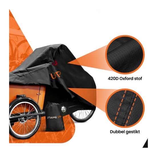 Bescherm jouw bakfiets tegen regen, wind en zon met deze hoogwaardige bakfietshoes van Frame Up. Dankzij het stevige en waterdichte materiaal blijft je bakfiets altijd droog en in topconditie — ideaal voor gezinnen en stadsfietsers.