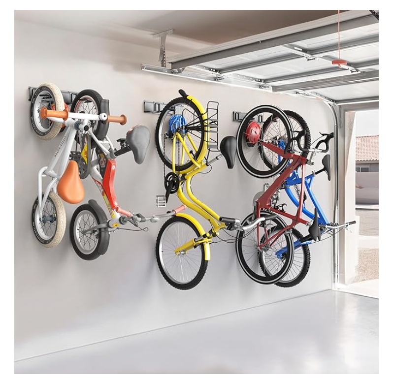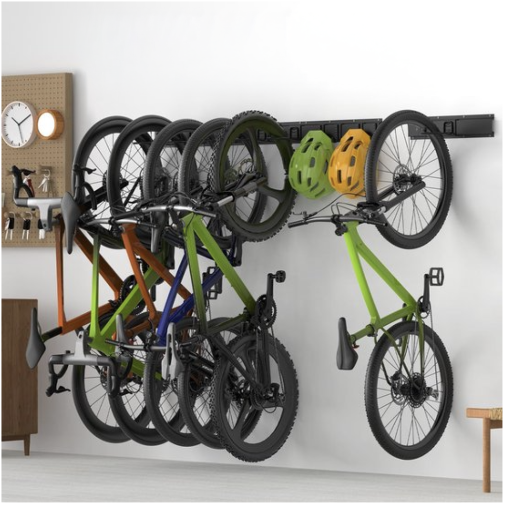 Met dit wandgemonteerde fietsenrek houd je jouw garage of schuur netjes, veilig en overzichtelijk. Het sterke metalen frame, de beschermende rubbercoating en het slimme railsysteem zorgen voor een duurzame, ruimtebesparende oplossing voor al je fietsen.